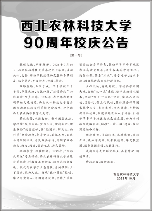 教稼之地,卓荦群芳。2024年9月10日,西北农林科技大学喜迎九十华诞,谨向关心、支持、帮助学校建设和发展的各界朋友、社会贤达、广大校友,致敬、感谢。
