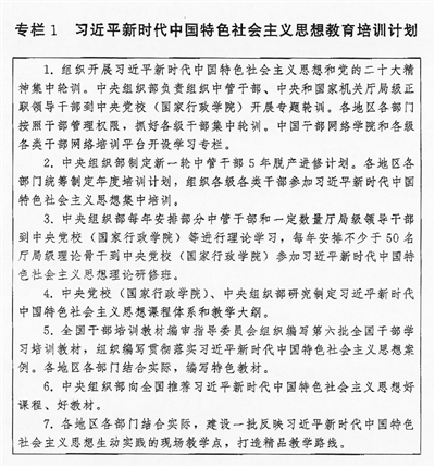 (一)聚焦聚力、久久为功。完善干部理论教育培训长效机制,落实党的创新理论学习教育计划,组织实施习近平新时代中国特色社会主义思想教育培训计划(见专栏1),系统谋划、持续用力,不断把思想铸魂、理论武装工作引向深入。坚持把习近平新时代中国特色社会主义思想作为党委(党组)理论学习中心组学习首要内容,作出具体安排、精心组织实施;作为各级党校(行政学院)、干部学院、社会主义学院主课必修课,办好理论进修班、理论研修班;作为干部学习的中心内容,全面系统学、持续深入学、联系实际学。以县处级以上党员领导干部为重点,开展习近平新时代中国特色社会主义思想和党的二十大精神集中轮训;深入开展主题教育,通过专题学习、研讨交流、主题党课、调查研究、建章立制等形式,推动党的创新理论学习教育走深走实走心,使广大干部更加深刻领悟“两个确立”的决定性意义,更加自觉增强“四个意识”、坚定“四个自信”、做到“两个维护”。