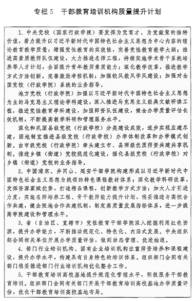 (一)培训机构建设。推进各级党校(行政学院)建设,以教学督导、师资培养、质量评估为重点,强化上级党校(行政学院)对下级党校(行政学院)的业务指导,不断提高办学水平。推进县级党校(行政学校)分类建设。加强社会主义学院建设。进一步提升部门行业培训机构、国有企业培训机构办学质量。加强对干部教育培训高校基地、基层干部教育培训机构办学指导。开展党校(行政学院)、省(自治区、直辖市)党性教育干部学院、干部教育培训高校基地办学质量评估。加强各类党员干部教育培训机构规范管理,严控新设以党员干部为培训对象的培训机构。支持地方、部门联合开展培训,鼓励干部教育培训机构开展区域协作交流,推动优质培训资源共享。实施干部教育培训机构质量提升计划(见专栏5)。