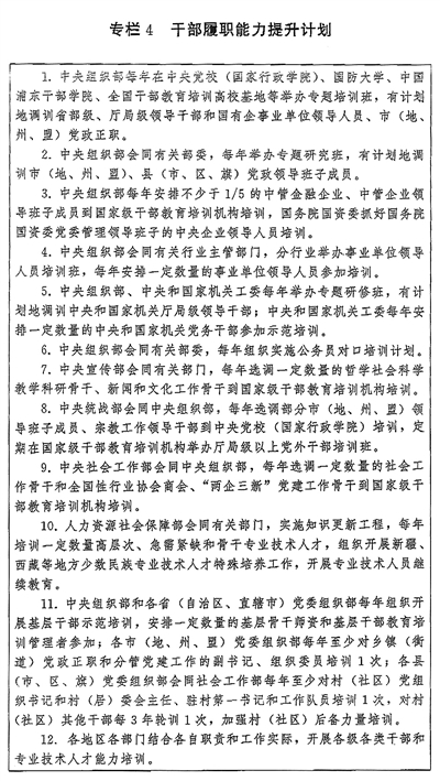 (二)拓宽培训渠道。根据党政领导干部、国有企事业单位领导人员和机关公务员、年轻干部、基层干部、专业技术人员等不同对象特点,整合优质资源,多渠道多方面开展履职能力培训。发挥各级党校(行政学院)、干部学院主体作用,围绕党中央重大决策部署和国家重大战略需求、地方党委和政府中心工作开展专题培训;发挥部门行业培训机构特色优势,开展专门政策解读、重点任务落实等专题培训;发挥国有企业培训机构作用,开展国有企业领导人员治企兴企、提高企业核心竞争力、强化企业科技创新主体地位等专题培训;发挥干部教育培训高校基地学科专业优势,开展新知识新技能等培训;发挥基层干部教育培训机构特色优势,开展基层干部实务培训;发挥专业技术人员继续教育基地资源优势,开展专业技术能力提升培训;发挥职业学校(含技工院校)培养高技能人才的基础性作用,开展技术技能培训;发挥中国干部网络学院等网络学习平台广覆盖、便捷化的优势,抓好履职通识培训;发挥派出单位和接收单位协作优势,抓好援派帮扶干部人才、挂职干部等教育培训。积极创造条件,支持干部在职自学。实施干部履职能力提升计划(见专栏4)。
