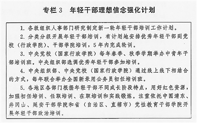 (三)加强年轻干部政治训练。强化习近平新时代中国特色社会主义思想学习教育,突出政治忠诚教育、理想信念教育、纪律规矩教育,加强优良传统作风和责任感使命感教育,强化斗争意识,综合运用理论讲授、政策解读、案例教学、现场体验等方式开展系统培训。党委(党组)负责同志要讲好“开班第一课”。安排思想政治素质过硬、理论水平较高、实践经验丰富的领导干部上讲台授课。探索推行“政治辅导员”、“导师帮带”制度。通过开展党性分析、实践锻炼、过“政治生日”、重温入党誓词等方式,锤炼党性修养、提高政治觉悟。实施年轻干部理想信念强化计划(见专栏3)。