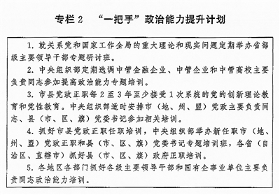 (二)突出“关键少数”政治训练。坚持把政治训练贯穿干部成长全周期,使干部的政治素养、政治能力与担负的领导职责相匹配。强化“一把手”政治培训,有计划地选调地方、部门、国有企事业单位主要负责同志到党校(行政学院)、干部学院参加专题培训。实施“一把手”政治能力提升计划(见专栏2)。省(自治区、直辖市)、市(地、州、盟)、县(市、区、旗)党政领导班子成员每2至3年到党校(行政学院)、干部学院至少接受1次系统的党的创新理论教育和党性教育,5年内累计不少于2个月。围绕提高政治能力和领导能力,加强机关司局长、处长任职培训。重视对女干部、少数民族干部、党外干部等的政治培训。加强对高层次人才的政治引领,中央组织部会同有关单位每年组织一定数量人才开展国情研修。