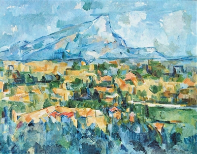 由此,塞尚、梵高、高更等艺术家的绘画语言逐渐展现出不同于印象派的风格。塞尚在绘画中抛弃了明暗和透视,寻求色彩与形状的互相牵制,使画面结构更加稳定严谨,制造出物与物之间的空间张力。他的油画作品《圣维克多山》(见图,曲音供图)用冷暖色搭配勾勒出许多几何形状的色块,形如房屋、状似树木,以相互交叠的视觉呈现替代了透视效果,暗示出远近和前后关系,令画面中的山峰无论从哪个角度观看都显得雄伟壮丽。
