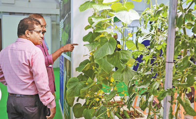 图为观众在参观沙地种植的蔬果。