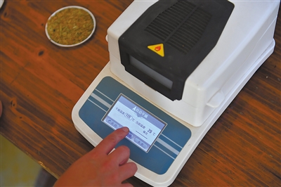 近日,湖南省浏阳市龙伏镇种植的晚稻进入成熟收割阶段,当地运用智能化机械设备展开作业,助力秋粮颗粒归仓。图为工作人员使用自动快速水分测定仪检测稻谷的含水量。
