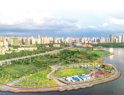 海南省海口湾片区,休闲步道沿海湾铺设,一派人与自然和谐共生景象。 |