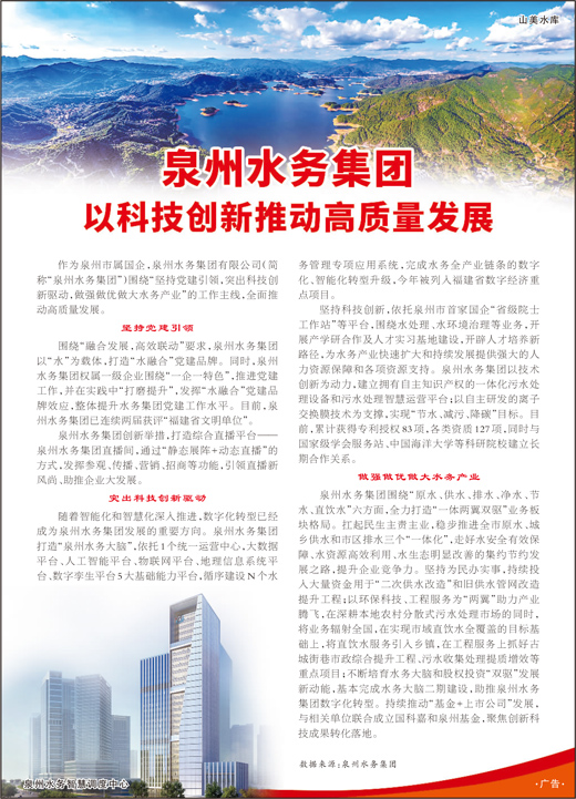 作为泉州市属国企,泉州水务集团有限公司(简称“泉州水务集团”)围绕“坚持党建引领,突出科技创新驱动,做强做优做大水务产业”的工作主线,全面推动高质量发展。