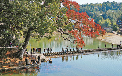 11月23日,游客在浙江省温州市泰顺县泗溪镇北涧桥边观赏树龄千年的乌桕树。