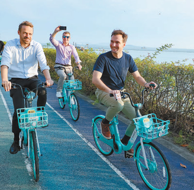 在无锡贡湖湾湿地公园,使节们骑上共享单车,沉浸式感受太湖秀美风光。 |