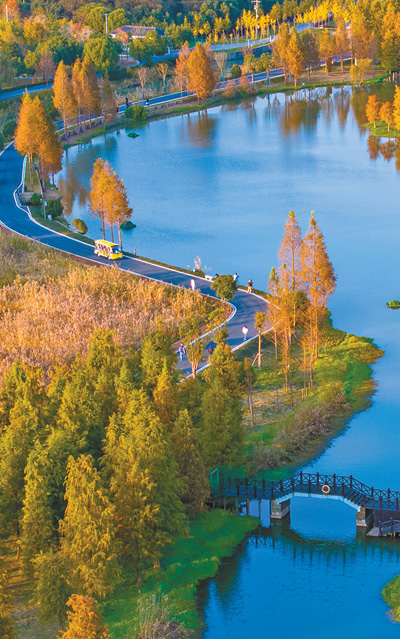 上海市青浦区青西郊野公园是以湿地为特色的郊野公园。近日,公园水上森林进入最佳观赏期。图为11月25日,青西郊野公园层林尽染,水美如画。