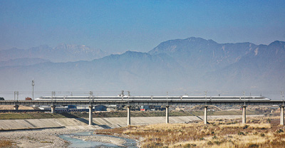 图为首趟川青铁路动车组从绵竹市绵远河大桥驶过。 |