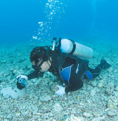 海南南海热带海洋研究所所长陈宏在珊瑚移植前进行海底环境调查。 |