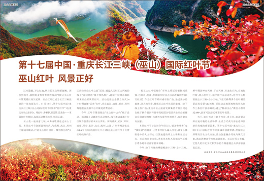 江水澄澈,万山红遍,秋日的巫山绚丽斑斓。深秋到初冬,独特的亚热带季风性湿润气候让巫山红叶景观得以持久延续。巫山红叶已成为长江三峡旅游的一张亮丽名片。11月18日,第十七届中国·重庆长江三峡(巫山)国际红叶节(简称“红叶节”)在重庆市巫山县举办。观红叶、参赛事、赏美景、品美食……本届红叶节期间,各项活动精彩纷呈、别出心裁。