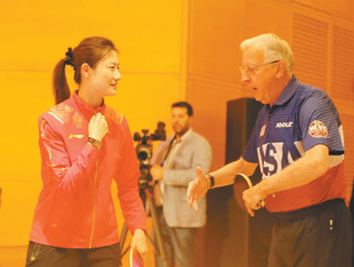 美国乒乓球名宿戴尔·斯威里斯与中国乒乓球名将丁宁在交流球技。 |