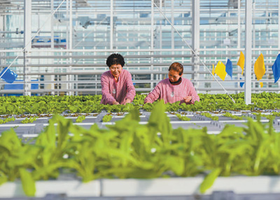 近年来,新疆维吾尔自治区昌吉回族自治州大力发展智慧农业,充分运用新技术,推动农业高效种植,提高蔬菜产量和品质。图为近日,工人在大棚里移栽蔬菜苗。 陶维明摄(人民视觉)
