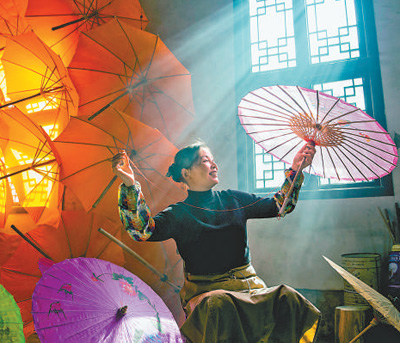 江西省上饶市婺源县,工人在制作纸伞。 |