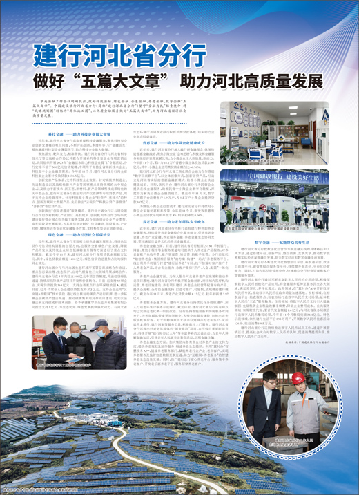 中央金融工作会议明确提出,做好科技金融、绿色金融、普惠金融、养老金融、数字金融“五篇大文章”。中国建设银行河北省分行(简称“建行河北省分行”)坚守“金融为民”职责使命,将“战略规划图”转化为“具体施工图”,以优质金融服务做好“五篇大文章”,助力河北省经济社会高质量发展。