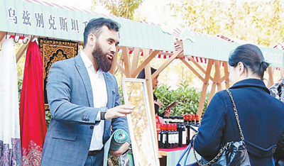 阿森贝克(左)在一场校园活动中介绍乌兹别克斯坦手工艺品。 |