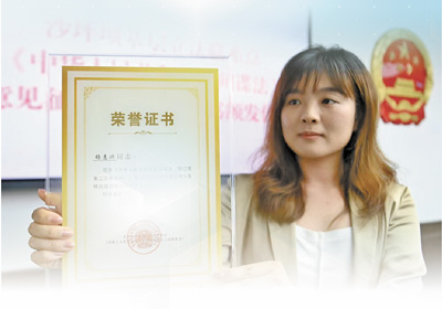 西南政法大学地方立法协同创新中心研究人员杨惠琪在重庆沙坪坝基层立法联系点提出的一条法律修改意见被全国人大采纳。图为沙坪坝区人大常委会向杨惠琪颁发的荣誉证书。 |