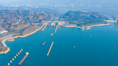 日前,长江三峡通航管理局发布数据显示:2023年三峡枢纽航运通过量达1.74亿吨,同比增长8.77%,创历史新高。其中,三峡船闸运行11066闸次,通过量1.69亿吨;三峡升船机运行4614厢次,通过量478.59万吨,护航旅客超220万人次。黄金水道航运效益进一步发挥。图为1月4日船舶行驶在三峡大坝上游三峡双线五级船闸引航道。