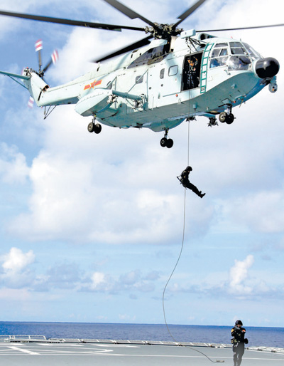 第6批护航编队直升机正在组织滑降训练。 |