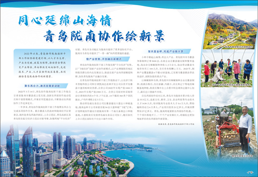 2022年以来,青岛协作陇南挂职干部工作组坚持党建引领,以人才为支撑、产业为突破、政策为保障,推动资金帮扶变产业帮扶、单向帮扶变双向协作,先进技术、产业、人才在协作地区集聚,共同描绘青岛陇南协作的新图景。
