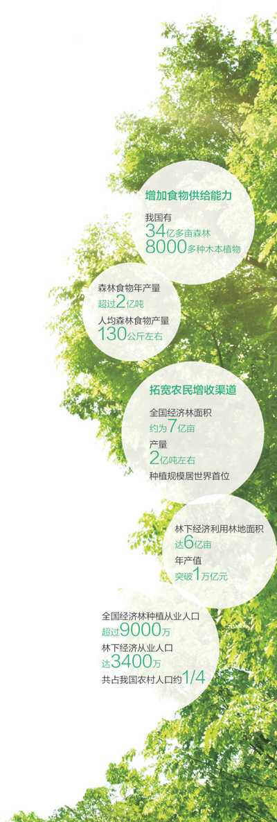 一组数据很说明问题:全国经济林种植从业人口超过9000万,林下经济从业人口达3400万,二者相加约占我国农村人口的1/4;一些林区山区农民收入的20%左右来自林产品,部分林业重点县超过60%。