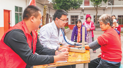 近年来,重庆市开州区常态化组织“义诊进乡村”活动,定期组织医护人员、志愿者进村入户,免费为村民开展上门问诊、健康检查、配药送药等暖心服务。图为1月11日,医务人员为开州区桔香村村民测量血压。