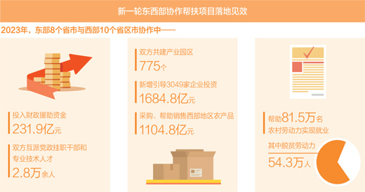当前,东西部协作已成为巩固拓展脱贫攻坚成果和推进乡村全面振兴的重要力量。2023年,东部8个省市向西部10个省区市投入财政援助资金231.9亿元,协作双方互派党政挂职干部3045人、专业技术人才2.5万人。在协作双方共同努力下,一大批帮扶项目落地见效,释放出澎湃动能。