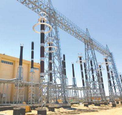 位于苏伊士省的埃克萨迪亚500千伏变电站项目现场,铁塔高耸,一条条高压输电导线接入变电站设备,电流通过导线时发出嗡嗡声。