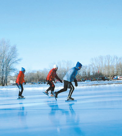 内蒙古自治区呼伦贝尔市扎兰屯市玉河湾滑冰场,滑冰爱好者乐享运动之趣。 韩颖群摄(影像中国)