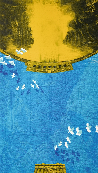 纵观长江主题美术作品会发现,古代绘画更强调通过邈远宏阔的山河意象表达对“天人合一”审美境界的追求,而当代美术作品则重在呈现更为丰厚的长江文化内涵。蕴含于民俗风物中的厚重历史、鲜活的生命情态,在长江主题美术作品中焕发动人光彩。在中国国家画院主办的“守护好一江碧水”长江主题美术作品展中,于文江中国画《滕王阁》以长江四大名楼之一入画,运用传统界画形式,使历史文脉跨越时空,在当代画卷中延续。透过画面,观众不难感受到艺术家在景观塑造中传递出的浓郁人文情怀与丰富文化想象。文化如水,水脉亦如文脉。长江的丰厚人文底蕴在美术作品中熠熠生辉。像方土中国画《长江文明之源·三星堆》、李学峰油画《良渚文明》等作品,通过多元视角和艺术语言寻古探源,揭示长江文化的独特内涵。这些创作表明,凸显美术作品的“地域性”不仅仅在于呈现自然之景,更重要的是表现在特定空间中生发出的人文精神。
