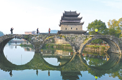 图为江永县夏层铺镇上甘棠村,游客在古桥上赏景。