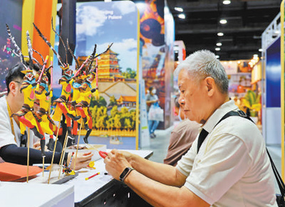 参观者在中国展区学习捏彩塑。 图为本报记者白元琪摄