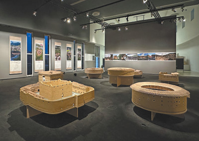 《福建土楼活化利用》展以舞台布景形式,通过7件大型土楼建筑模型和丰富的图形影像呈现独特的地方建筑传统和历史风貌,以及活化利用后的新形象和功能转型,展现了土楼在中国乡村全面振兴进程中如何承载集体记忆,凸显了当地独特的文化标识。展厅窗外不远,同属世界文化遗产的埃菲尔铁塔与土楼模型遥遥对望,美美与共。