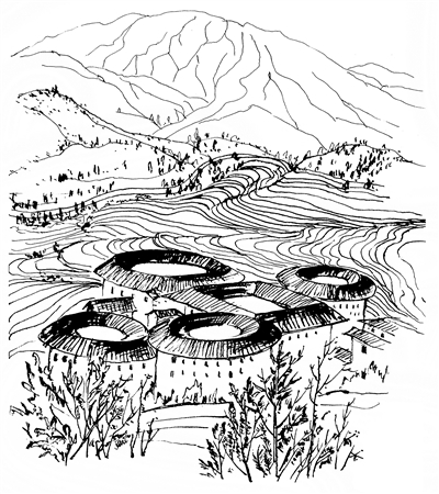 南靖县田螺坑土楼群(绘画)。 |