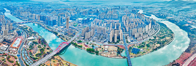 江西赣州是著名的革命老区。近年来,赣州立足自身的区位优势和资源优势,加快推进城市能级提升行动,发展动能不断增强、质量效益显著提高,高质量发展迈出坚实步伐,老区展现新面貌。2023年全市地区生产总值超过4600亿元,同比增长5.3%。脱贫人口人均纯收入增长13.8%。图为章江蜿蜒穿过赣州市城区,构成一幅美丽的发展画卷。