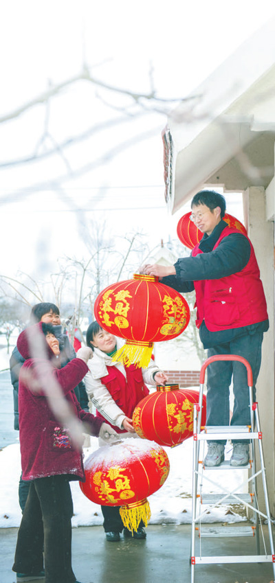 江苏省宿迁市,志愿者在帮当地村民挂灯笼。 |