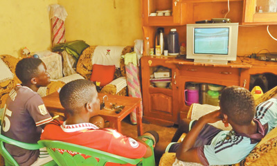 在乌干达恩德培附近的布诺诺村,当地青年通过“万村通”卫星数字电视收看本届非洲杯比赛。 |