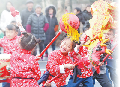 小朋友在浙江湖州市德清县下渚湖街道上杨村表演舞龙。 |