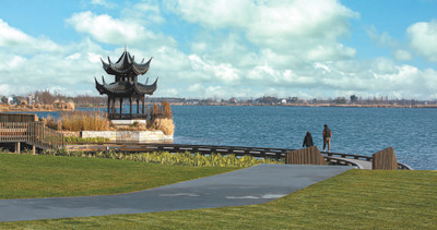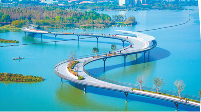 示范区加强生态环境综合治理,以太浦河、淀山湖、元荡、汾湖“一河三湖”为重点,大力推进岸线综合整治。图为横跨沪苏两地的元荡慢行桥。 |