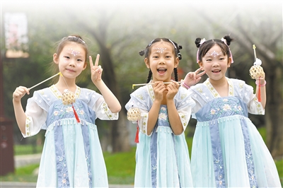 湖北省武汉市堤角公园,小朋友身穿汉服参加游园活动。 |