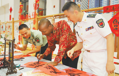 日前,中国人民解放军驻吉布提保障基地举办春节文化交流活动。图为非洲朋友体验中国书法创作。 郭文成摄
