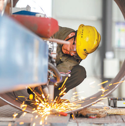 2月19日,河北邯郸市复兴区西部生态精品钢铁智慧物流港,工人在打磨压力容器。 |