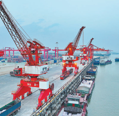 2月19日,江西南昌市龙头岗综合码头,起重机在装运化肥。 |