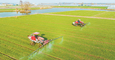 眼下正值小麦春季田管的关键期,各地不误农时,组织大型农业植保机械进行田间作业,为粮食生产打下基础。(相关报道见第十三版)图为2月27日,江苏省兴化市林湖乡朱胖村,农场工作人员驾驶农机进行田管作业。