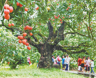 苍劲挺拔、郁郁葱葱的古树不仅美了乡村环境,寄托着人们的乡愁,还蕴藏着新的“财富密码”:目前,高州市已建成古荔枝树小公园5个,形成以古荔枝树为主题的旅游景点20多个。以景观大道、根子河碧道为主轴的“甜美果海”乡村旅游精品线路示范带,将文旅景点串珠成链,年吸引游客超200万人次。“文化+荔枝”“旅游+荔枝”的融合发展模式在探索中逐渐形成。