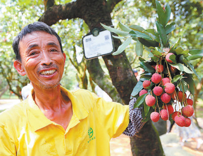 在柏桥村荔枝种植园,一位果农展示从树龄约1300年的古树上采摘的荔枝。 |