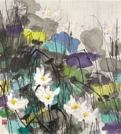 中国画《多彩荷塘》,作者马书林。 |