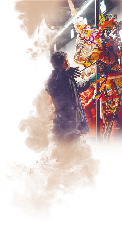 《无界·长安》表演中,演员在操作皮影。 |